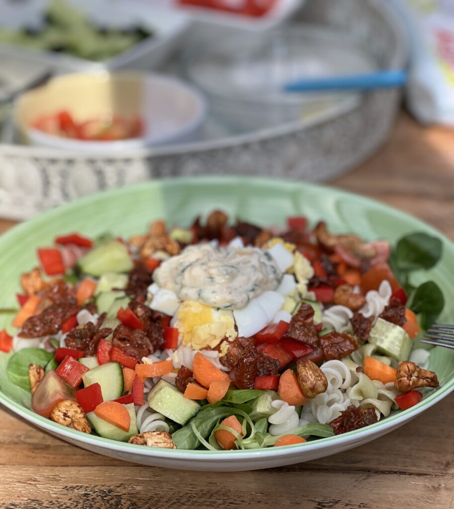 Vandaag voorspellen ze voor ‘t eerst dit jaar maar liefst 18 graden! 🤩 Ga jij ook met ‘t bord 🍽️ op schoot een plekje in ‘t avondzonnetje opzoeken? ☀️ Deze pasta-salade leent zich daar uitermate goed voor!