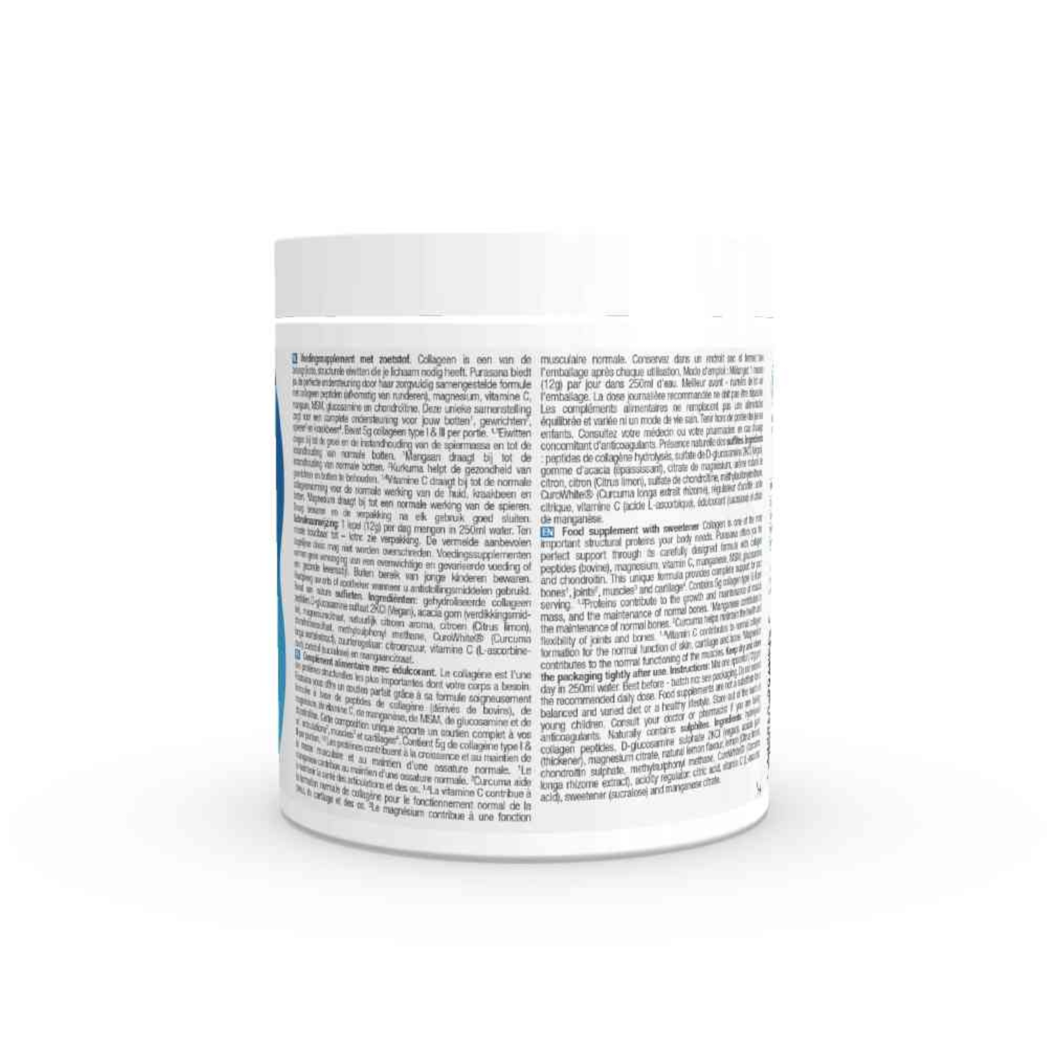 De formule met citroen levert een combinatie van goed opneembaar rundercollageen van types I en III, vitamine C, glucosamine, chondroïtine, kurkuma en magnesium voor botten en gewrichten.