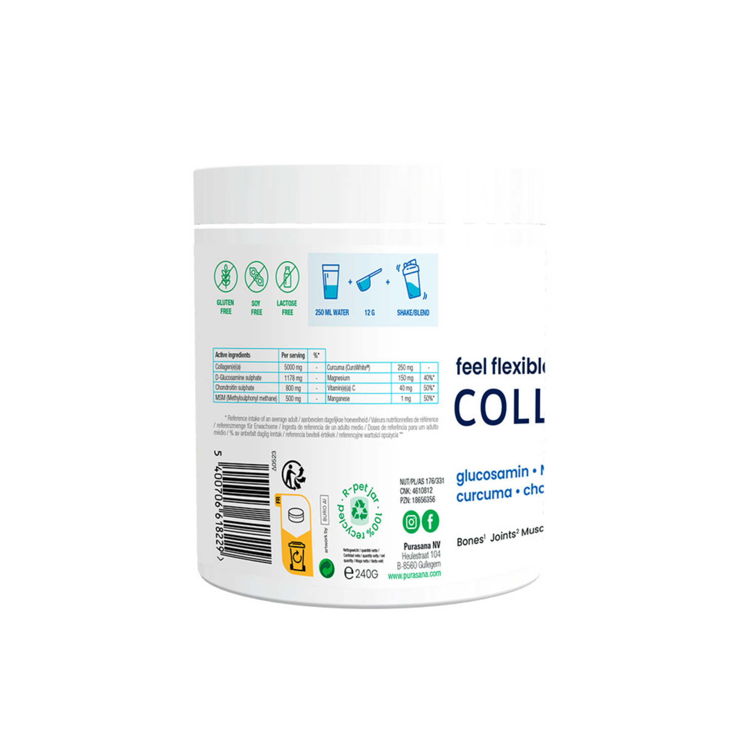 Collageen Supplement Citroen Purasana – Collageen is een eiwit dat de weefsels zoals de gewrichten bijeenhoudt en ze structuur geeft. Je lichaam maakt zelf collageen door aminozuren uit voeding te combineren.