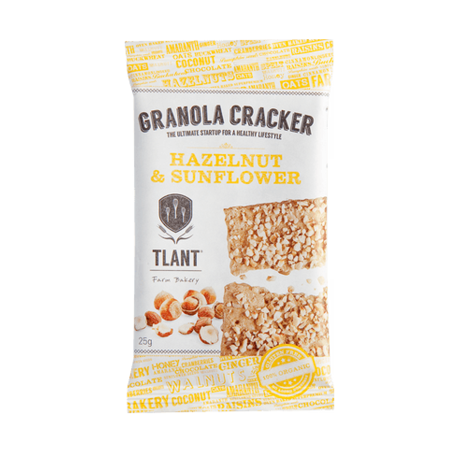 Hazelnoten (23%)*, Rijstmeel*, Maïszetmeel*, Glutenvrije Haver*, Zonnebloemolie*, Margarine* (Cacaovet, Zonnebloemolie, Water), Zonnebloempitten (7%)*, Lijnzaad*, Dadelsiroop*, Sesamzaad*, Rijsmiddel: Koolzuur, Verdikkingsmiddel: Guargom*, Zout, Kaneel*, Kardemomzaadjes*, Water.