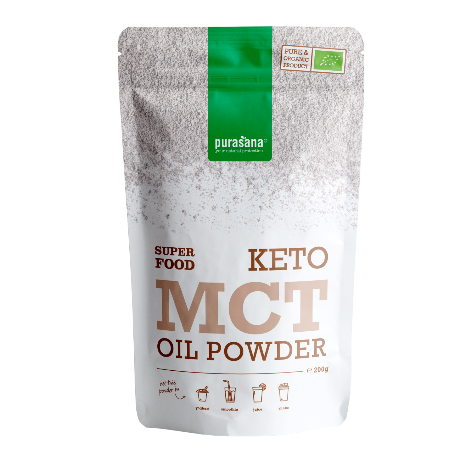 Purasana MCT Poeder bevat 100% puur MCT oliepoeder, zonder extra toevoegingen. Het product is gecertificeerd biologisch, vegan en koosjer, is bovendien vrij van de allergenen gluten, lactose en soja.