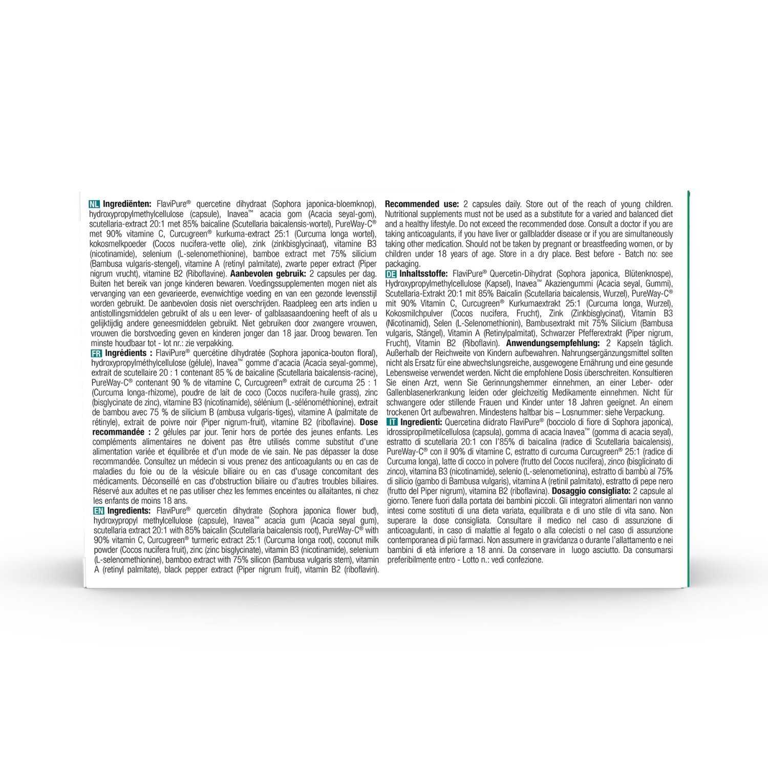 FlaviPure® quercetinedihydraat (Sophora japonica-bloemknop), hydroxypropylmethylcellulose (capsule), Inavea™ acacia gom (Acacia seyal-gom), scutellaria-extract 20:1 met 85% baicaline (Scutellaria baicalensis-wortel), PureWay-C® met 90% vitamine C, Curcugreen® kurkuma-extract 25:1 (Curcuma longa wortel), kokosmelkpoeder (Cocos nucifera-vette olie), zink (zinkbisglycinaat), vitamine B3 (nicotinamide), selenium (L-selenomethionine), bamboe extract met 75% silicium (Bambusa vulgaris-stengel), vitamine A (retinylpalmitaat), zwarte peperextract (Piper nigrum vrucht), vitamine B2 (Riboflavine).